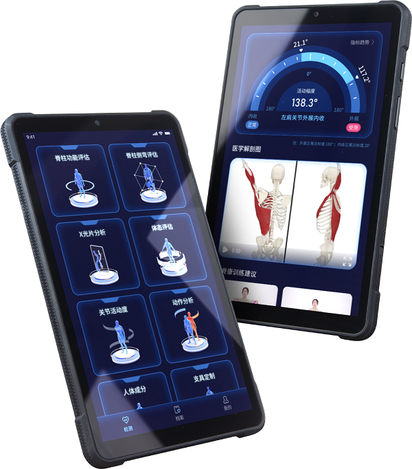 1.智能检测与评估:设备集成脊柱功能评估、脊柱侧弯筛查、体态评估、X光分析、关节活动度评估等多项功能,可减少人为误差。
