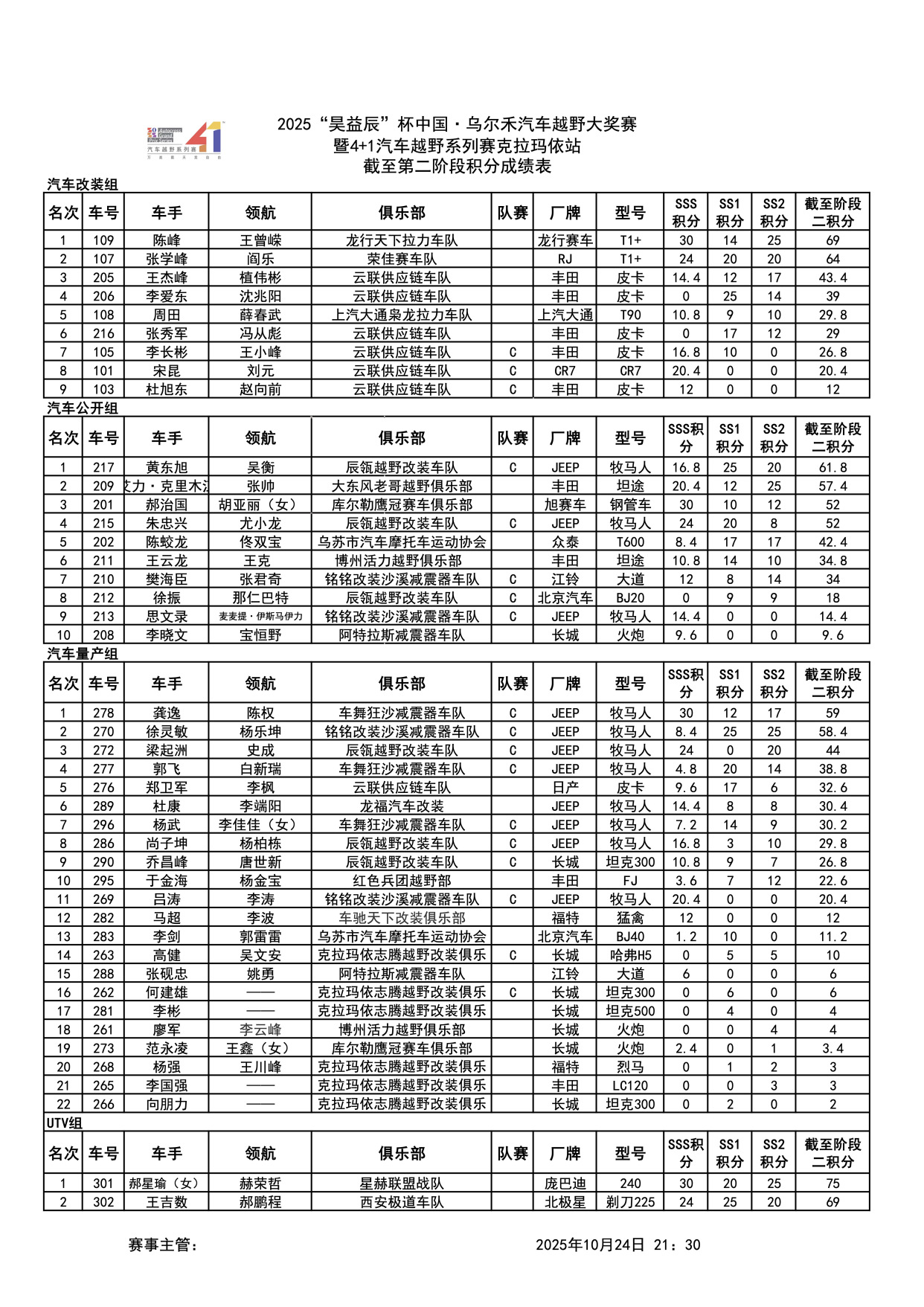 汽车公开组与汽车量产组同样竞争激烈,车手们通过每一个赛段的努力,不断累积积分,为最终的胜利奠定基础。UTV组中,星赫联盟战队的郝星瑜(女)凭借出色表现,暂时位居榜首,展现了女性车手在越野赛车领域的非凡实力。