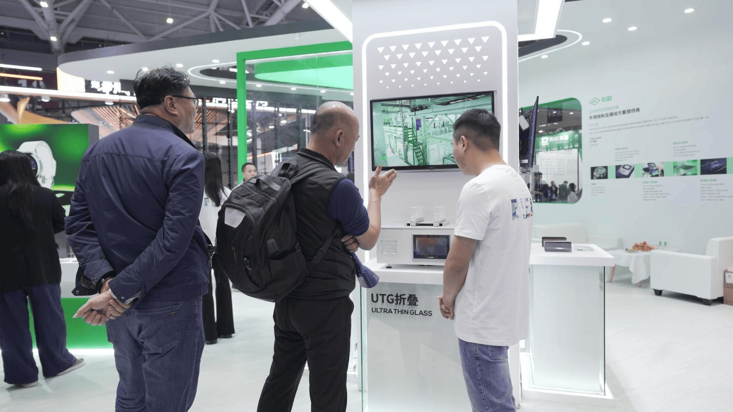 在产品测试区,全球首款可变厚度超薄玻璃(Variable Thickness Glass,简称VTG)的弯折实验成为现场焦点,只见弯折机反复折叠样品,玻璃始终保持柔韧状态,展开与闭合前后无折痕呈现,引得围观观众频频驻足惊叹。这款VTG弯折区薄至30微米,可轻松适配折叠动作;非弯折区厚度则达300微米以上,强度与直板手机玻璃面板不相上下,兼顾柔性与耐用性。